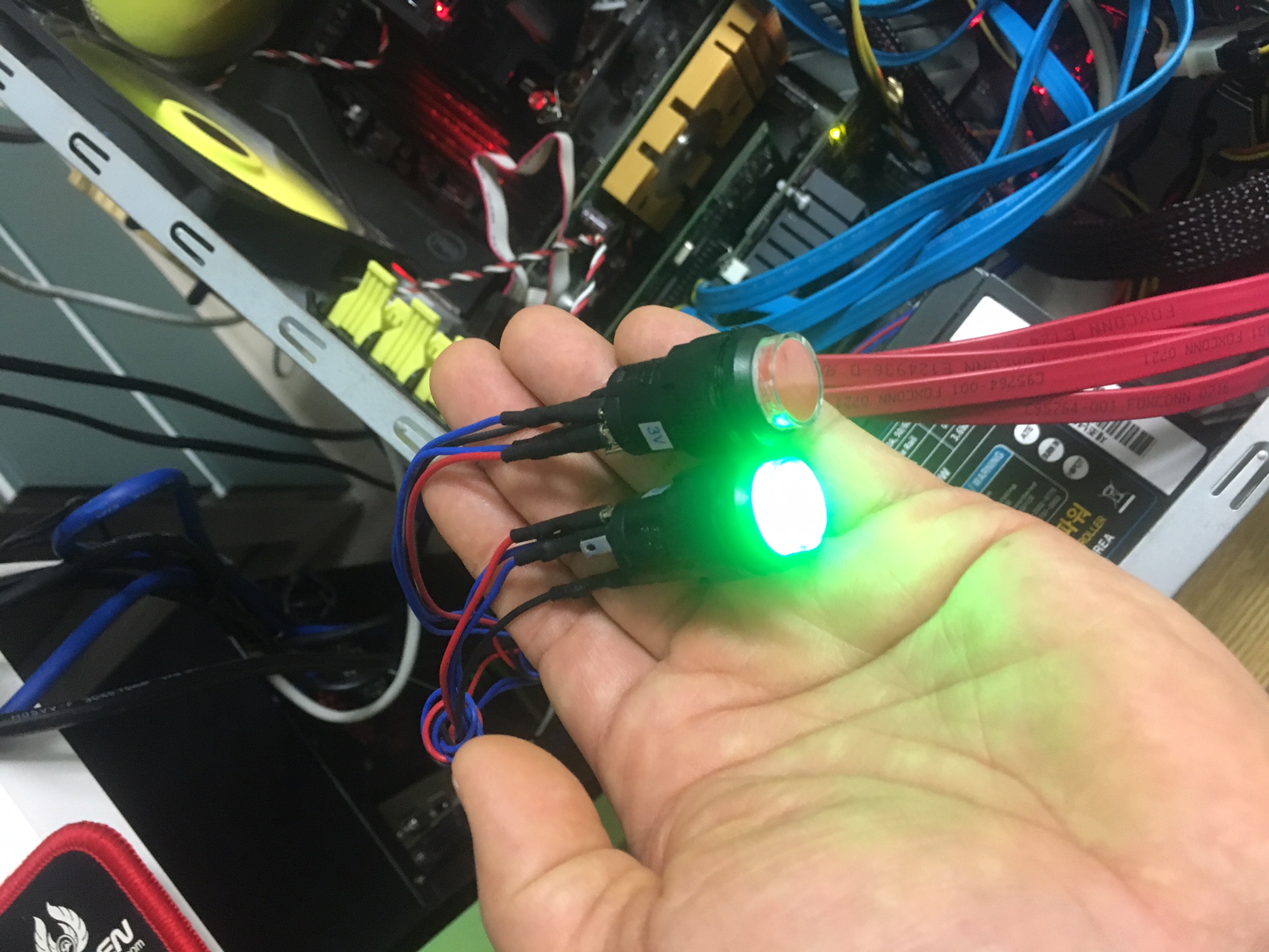 IDC의 데스크탑 케이스 선반이 케이스 백패널을 앞으로 노출하도록 장착을 요구하고 있어 저렇게 전원, 리셋 스위치를 달았습니다. 전원 들어가면 불 들어옵니다. 용산 전자랜드 지하1층 가면 저런 스위치 파는 업체들이 몇몇 있습니다. NIC 포트 1개는 안 쓸 거라 스카치테이프로 밀봉(?)했습니다.